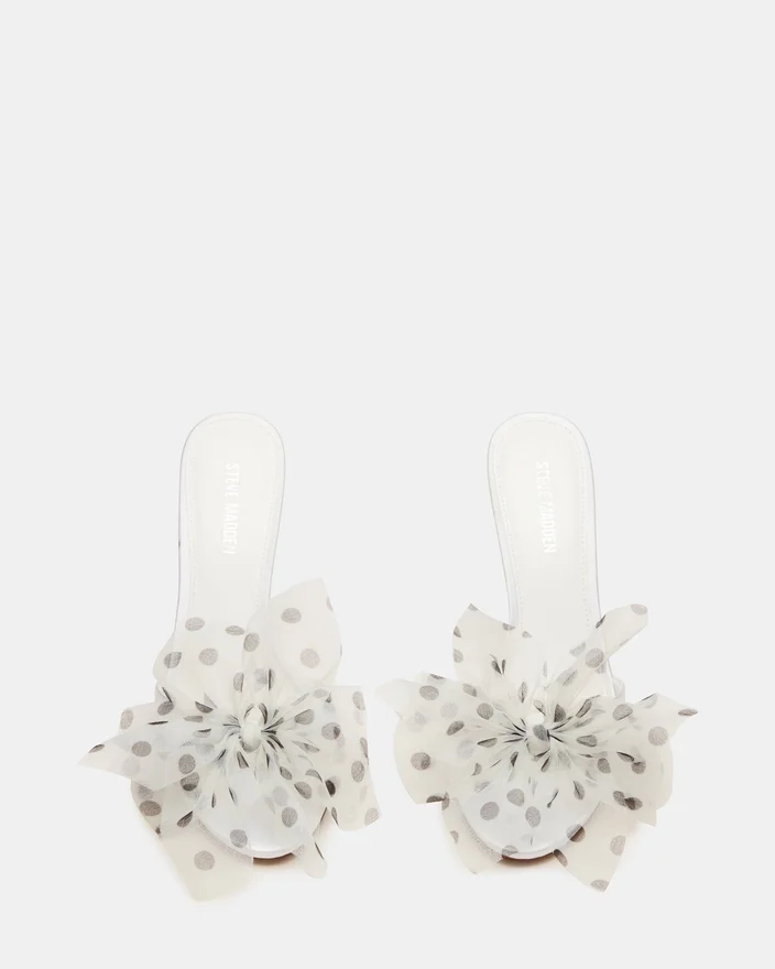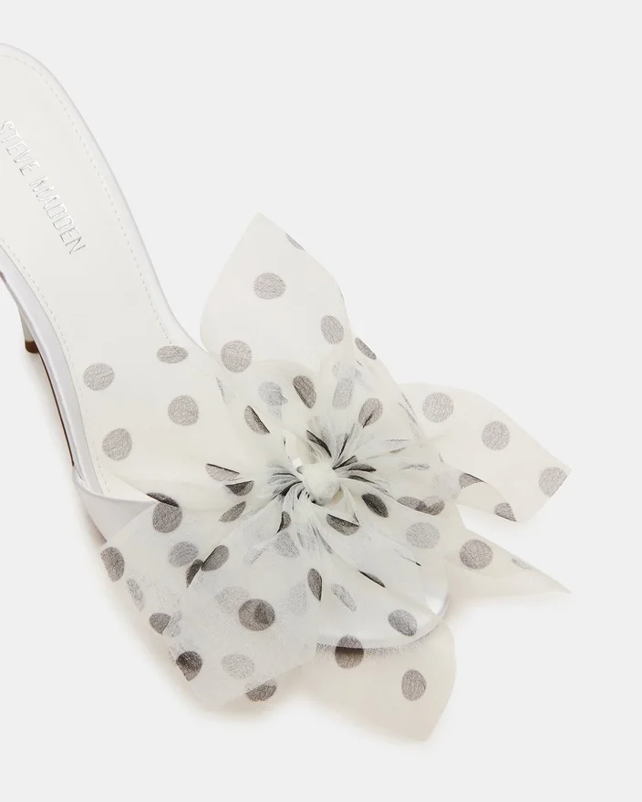 Die Davina Tulle White/Black Polka Dot Pantolette verbindet zeitlose Eleganz mit moderner Vielseitigkeit. Dieser Stöckel mit offener Zehenpartie besticht durch eine schlanke, runde Zehenform, die jedes Outfit aufwertet. Das stromlinienförmige Absatzdesign sorgt für eine raffinierte Höhe und bietet gleichzeitig den ganzen Tag über hohen Tragekomfort. Perfekt für den Übergang vom Büro zum Abend – diese unverzichtbare Pantolette sorgt für einen eleganten Stil mit müheloser Anmut.