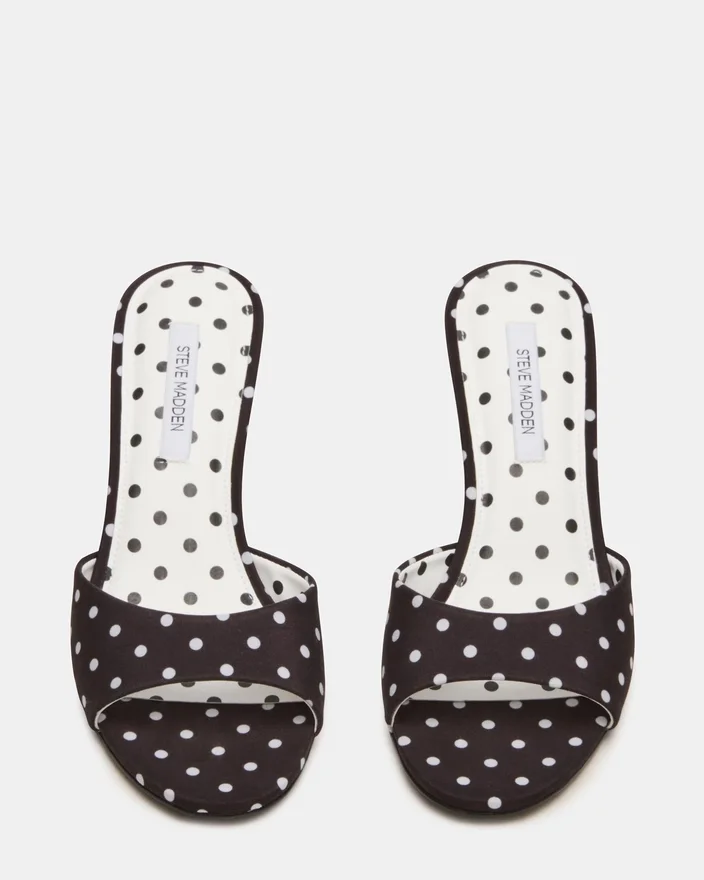 Die Kendrix Pantolette mit schwarzen und weißen Polka-Dots wurde aus luxuriösen Materialien gefertigt und verfügt über eine abgerundete Zehenpartie für zusätzlichen Komfort und Eleganz. Diese High Heels eignen sich perfekt für jeden Anlass und verleihen jedem Outfit mühelos einen Hauch von Raffinesse.