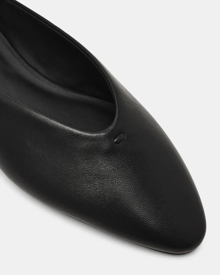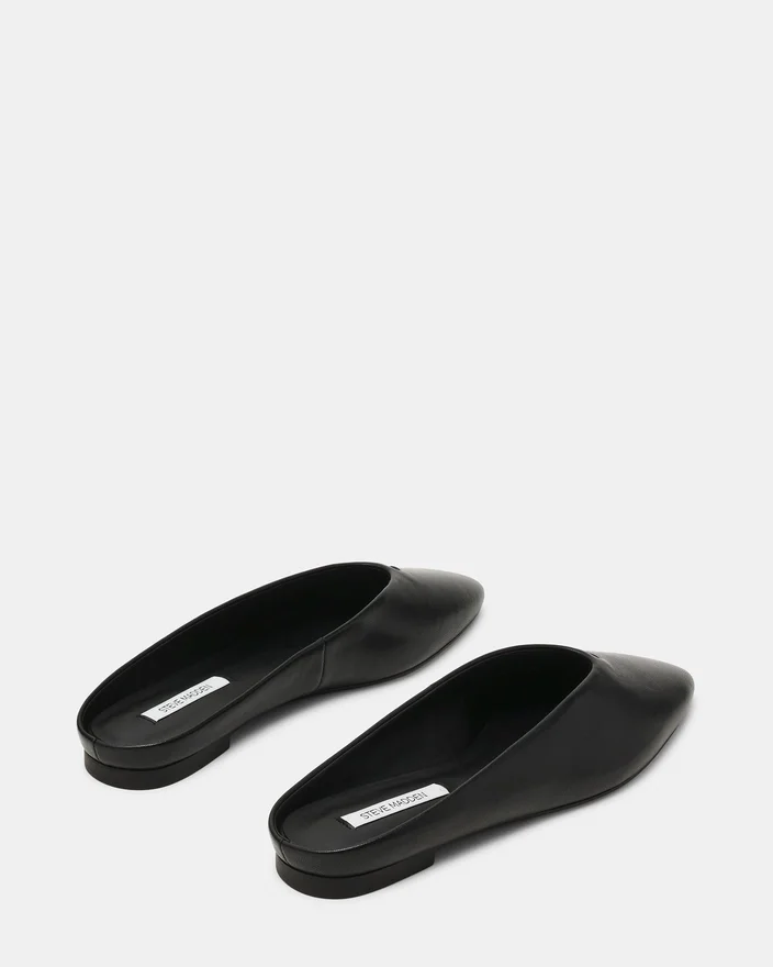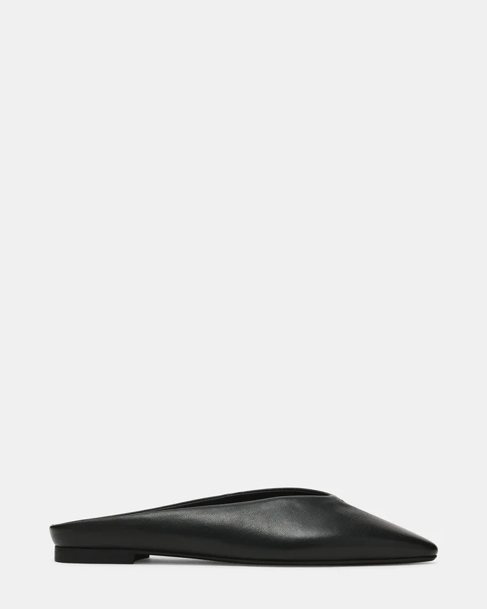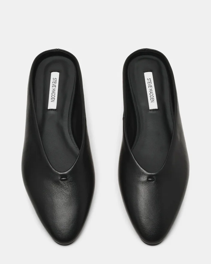 Die Sherman Mule aus schwarzem Leder besticht durch ihre zurückhaltende Eleganz mit mandelförmiger Zehenpartie und bequemer Slip-On-Passform. Dieser flache Schuh bietet den ganzen Tag über Komfort, ohne dabei an Eleganz einzubüßen, und ist somit ein unverzichtbarer Bestandteil jeder Garderobe. Das schlanke Design lässt sich mühelos vom Büro in den Abend überführen, während die sichere Passform den ganzen Tag über für Stabilität sorgt. Ein vielseitiges Basisteil, das zu allem passt, von taillierten Hosen bis hin zu fließenden Kleidern.