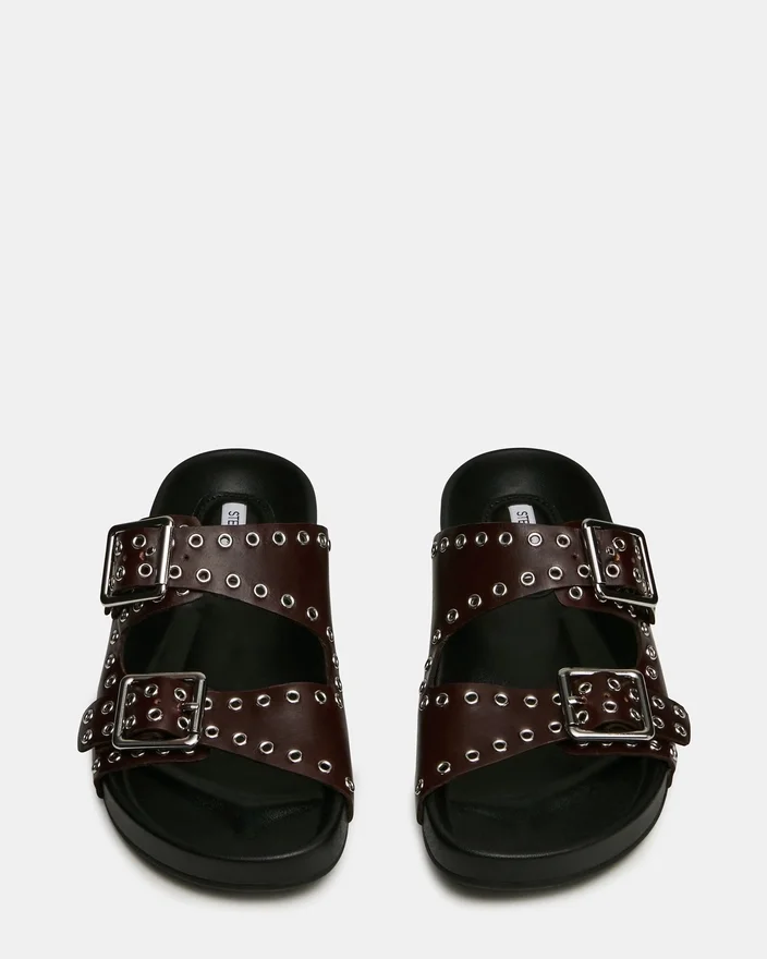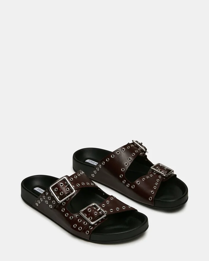 Die Abott Burgundy Leder-Sandale verbindet zurückhaltende Eleganz mit praktischem Komfort. Aufwendige Ösenverzierungen zieren das Obermaterial, während zwei Schnallen für eine individuell anpassbare, sichere Passform sorgen. Das stützende Fußbett ist für langen Tragekomfort ausgelegt, was diese Sandale zu einer raffinierten Wahl für alle macht, die von ihrem Alltagsschuhwerk sowohl Stil als auch Funktionalität erwarten.