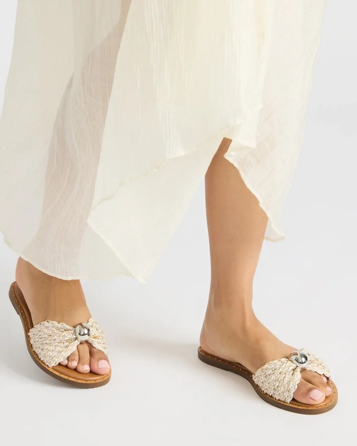 Diese Dipsy-Slide-Sandale verfügt über Mini-Nieten und eine abgerundete Zehenpartie für zusätzlichen Stil und Komfort. Als perfekte Kombination aus Mode und Funktionalität sind diese Sandalen ein Must-Have für jede Garderobe. Mit ihrem natürlichen Raffia-Design verleihen sie jedem Outfit einen Hauch von rustikalem Charme.