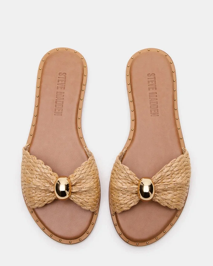 Diese Dipsy-Pantolette verfügt über Mini-Nieten und eine abgerundete Zehenpartie für zusätzlichen Stil und Komfort. Als perfekte Kombination aus Mode und Funktionalität sind diese Sandalen ein Must-Have für jede Garderobe. Mit ihrem Design aus natürlicher Raffia verleihen sie jedem Outfit einen Hauch von rustikalem Charme.