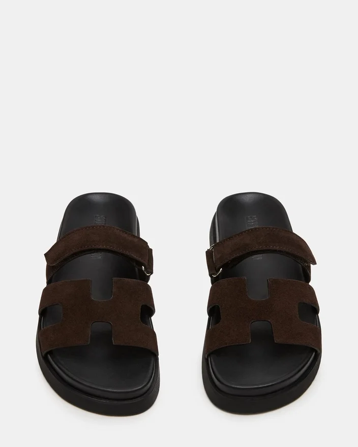 Die Mayven Slides aus schokoladenbraunem Wildleder zeichnen sich durch komfortable Konstruktionsdetails wie ein geformtes Fußbett, eine profilierte Flatform-Sohle und einen verstellbaren oberen Riemen sowie einen vorderen Riemen mit geometrischem Cutout-Design aus.