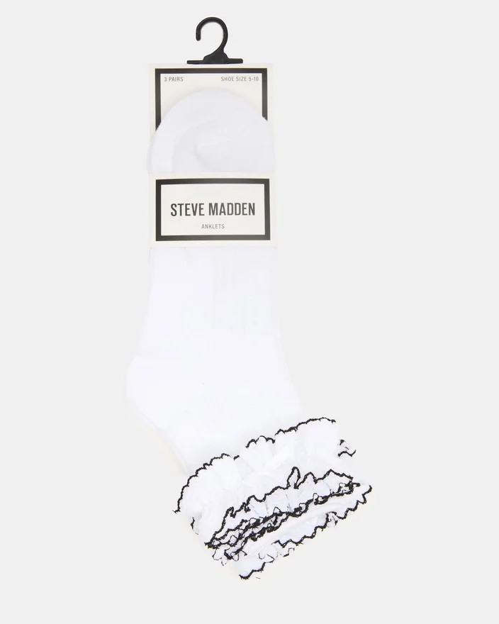 Werten Sie Ihre Sockenschublade mit diesem vielseitigen 2er-Pack Ava Rüschen-Socken in Weiß auf. Jedes Paar verfügt über charmante doppelte Rüschen und knackig weißen Stoff, akzentuiert durch schwarze Paspeln, für einen eleganten, modischen Look. Das Rüschen-Design verleiht jedem Outfit Struktur und Charakter, während die klassische Farbkombination eine einfache Kombination mit Ihrer bestehenden Garderobe gewährleistet. Diese Socken eignen sich perfekt zum Kombinieren mit Sneakern oder zum Zeigen mit Loafern und bieten sowohl Stil als auch Komfort für den Alltag.