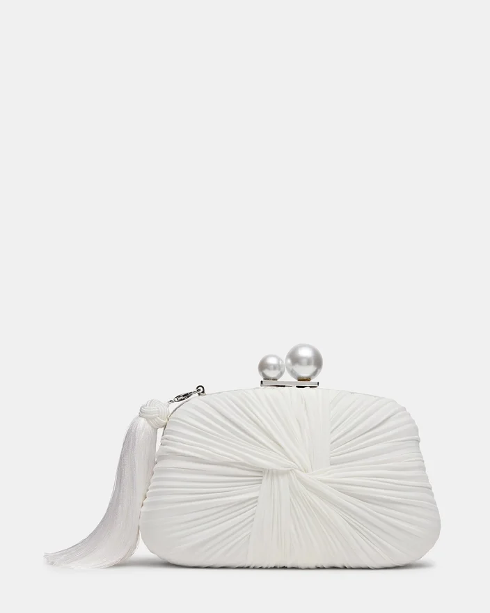 Die Rosalie-Tasche in Weiß vereint architektonische Eleganz mit raffinierter Handwerkskunst. Diese strukturierte Clutch in Sanduhrform verfügt über einen Metallrahmen und handgerüschten, mikroplissierten Seidenstoff, der durch ein auffälliges, verdrehtes Motiv in der Mitte akzentuiert wird. Eine luxuriöse, abnehmbare weiße Quaste mit geflochtener Endkappe und asymmetrischem Perlenverschluss sorgt für ein raffiniertes Detail. Der intuitive Push-Pull-Mechanismus sorgt für mühelosen Zugriff, während Innenfächer für Karten Ordnung in den wichtigsten Utensilien schaffen. Mit dem mitgelieferten, abnehmbaren Ketten-Schulterriemen lässt sich die Tasche nahtlos vom Tag in den Abend übertragen und bietet vielseitige Styling-Möglichkeiten für jeden Anlass.
