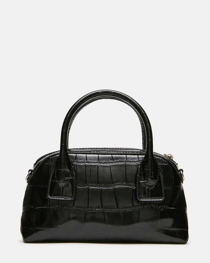 Die Melodie-Tasche in Schwarz-Krokodil verfügt über einen vielseitigen Tragegriff sowie einen abnehmbaren Schulterriemen für flexible Tragevarianten. Veredelt mit einem charmanten, abnehmbaren Bären-Taschenanhänger und einem farbenfrohen Schal verleiht sie Ihrem Outfit eine raffinierte Note. Sichern Sie Ihre wichtigsten Utensilien mit dem Reißverschluss, während die Innentasche an der Rückwand übersichtlichen Stauraum für kleinere Gegenstände bietet. Diese Tasche verbindet stilvolle Akzente mit praktischem Design und eignet sich perfekt für den eleganten Alltag.